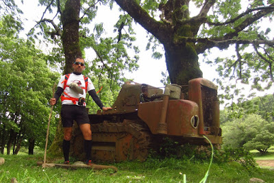 Une courte descente m'amène auprès de la bonne ruine de Campeau, de son épave de tracteur toujours présente et de quelques chevaux qui broutent en paix. Plus d'erreur possible maintenant, je suis sur le Sentier Cathare fraichement balisé en rouge et blanc, depuis qu’il a été introduit dans le cercle des sentiers de grande randonnée. A titre personnel, je préférais son balisage personnalisé, ce point orange surmontant traits jaunes et bleus. Mais c'est sans doute un détail, qui ne m'empêche pas de me diriger d'un bon pas vers le Roc Paradet.